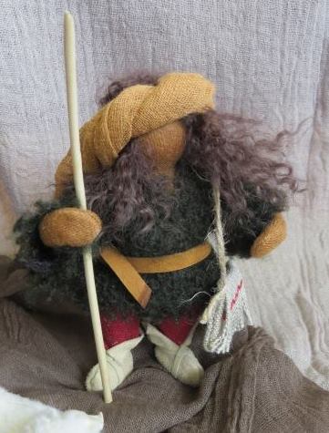 Seine Haut ist mittelbraun, seine Haare lang gelockt. In der Hand hält er einen Stab, eine Jutetasche hat er umgehängt.