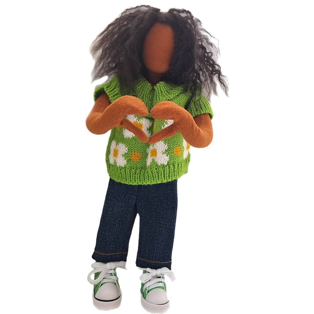 Supercooler Strickpullover mit Blumen, dazu eine Jeans und grüne Turnschuhe. Ein ganz tolles Bekleidungsset für eine Frau 28cm.