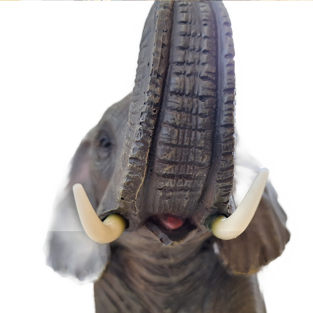 Sehr lebensecht wirkt der Elefant durch seine faltige Haut und auch aufgrund der natürlichen Pose mit dem nach oben gereckten Rüssel.