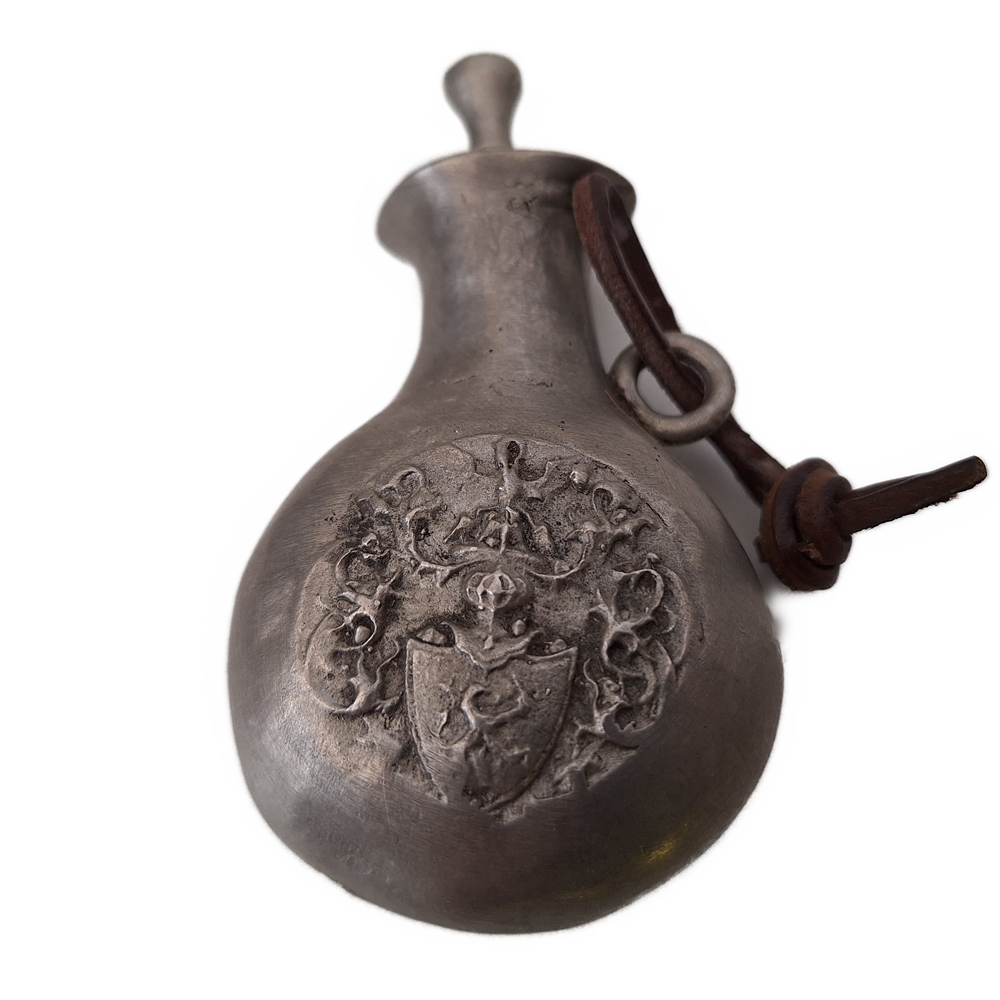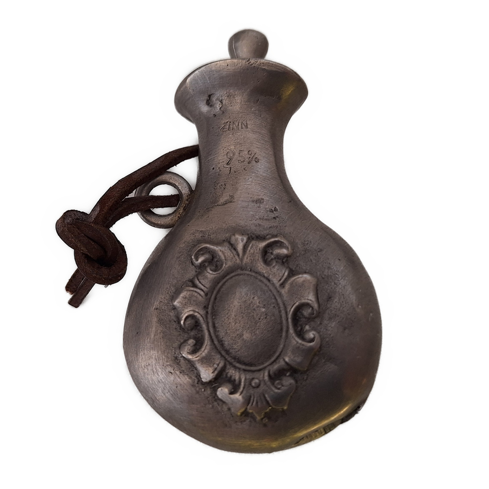 Diese Zinnflasche sieht aus, als wäre sie von Hand gefertigt. Sie trägt einen Stempel 95% Zinn und hat unten eine beschädigte Stelle. Sie hat einen charmanten alten Charakter und passt in ihrer rustikalen Machart ideal zu unseren Figuren.