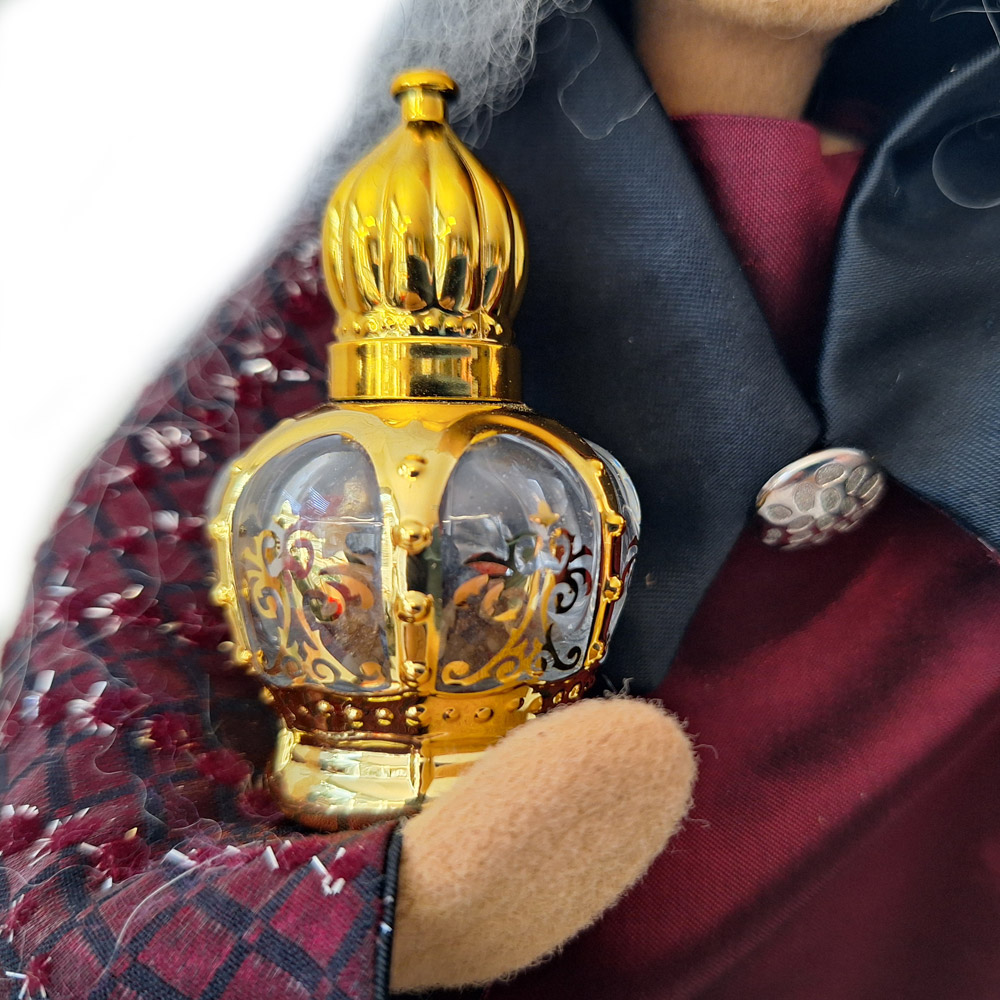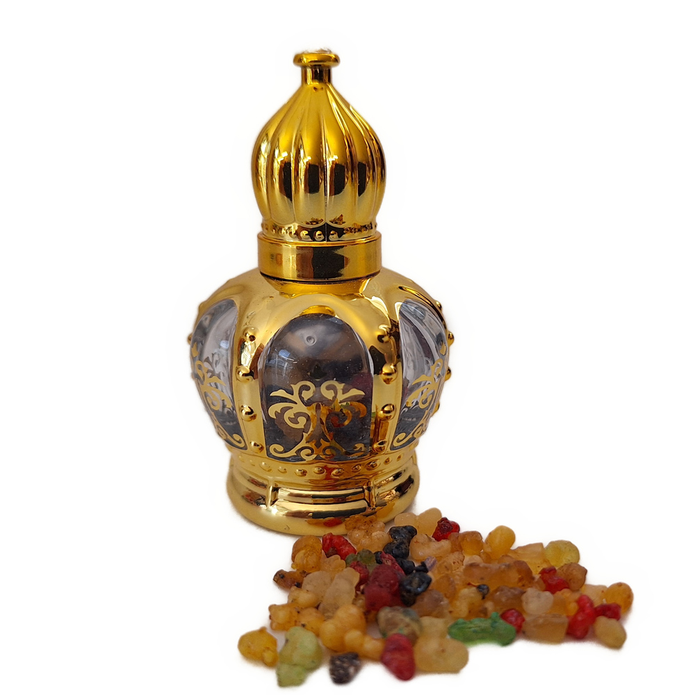Dieses wunderschöne Gefäß ist aus bruchsicherem Glas mit glänzender Goldfarbeschön bemustert, sodass es einen wirklich edlen Charakter bekommen hat. Der Deckel ist abnehmbar, obenauf prangert ein "Diamant". Wir haben unser Myrrhegefäß mit Weihrauch befüllt, den sieht man durchschimmern.