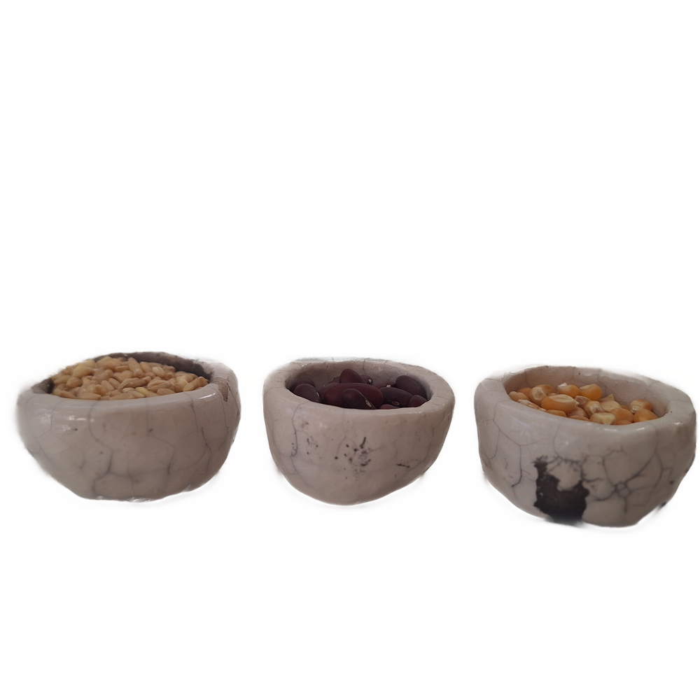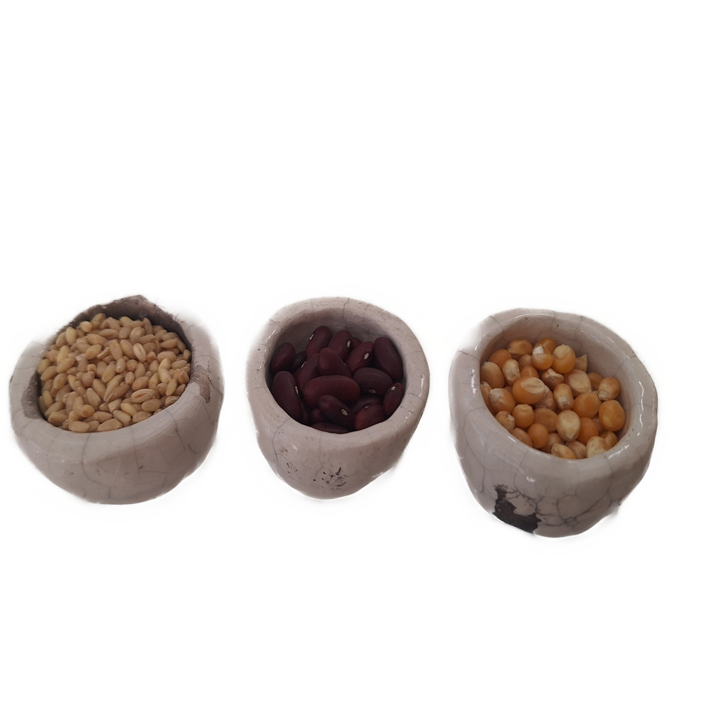 Drei handgefertigte Rakkuschalen, die wir mit Mais, Weizen und Bohnen gefüllt haben. Sie bereichern Marktszenen, eignen sich fürs Nomadenzelt und passen in sehr viele Figurenszenen. 3cm hoch - 6cm Durchmesser