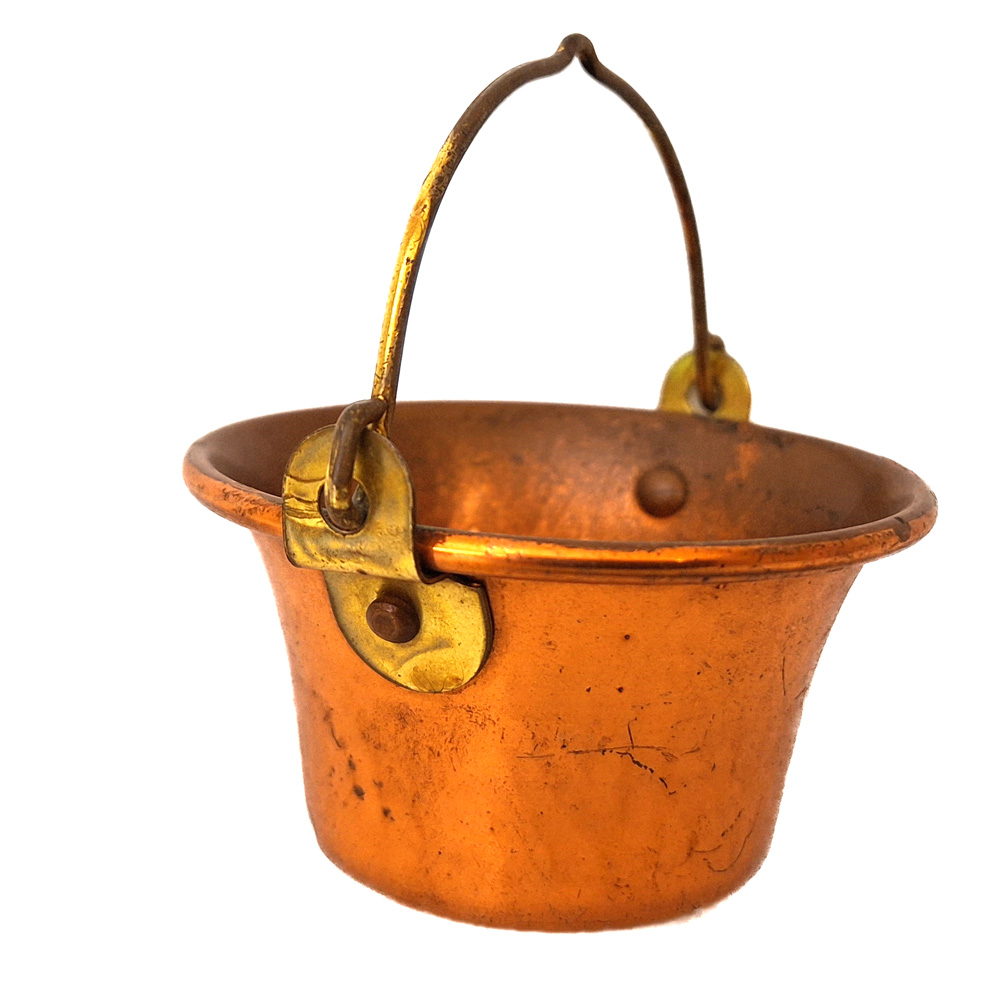 Die Kupferkessel aus den 60er Jahren findet man nicht mehr so oft. Dieser ist 4cm hoch, der Henkel kommt noch dazu, der Durchmesser ist 7cm. Er hat altersgemäße Patina.