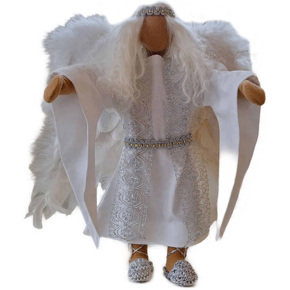 Spirituell gesehen unterstützt er die geistige und körperliche Reinigung und wird immer in hellem Kleid als Lichtgestalt dargestellt. Das Kleid besticht durch einen leicht ausgestellten Saum und lange Spitzärmel. Ein edler Reif verziert das Haar, die goldenen handgehäkelten Sandalen passen wunderschön dazu.