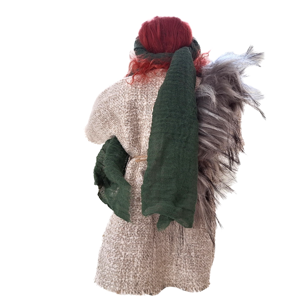 Esau und Jakob sind zwei sehr ungleiche Brüder. Während Jakob angepasst und häuslich ist, ist Esau wild und zügellos, ein Jäger und Macher. Es heißt, er habe rotes Haar gehabt. So haben wir Esau als richtige Charakterfigur gestaltet mit wildem rotem Bart, Umhängefell und Jägerutensilien. Das sind hölzerne Eicheln am Gürtel, eine gefilzte Umhängetasche mit einem tollen Tierzahn als Verschluß sowie eine Keule.