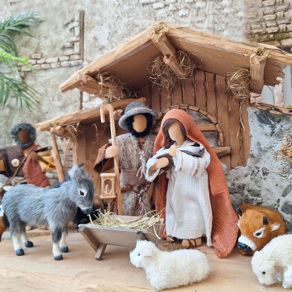 Wählen Sie die Farbe der Kleidung von Maria, ebenso deren Haarfarbe und Frisur. Josef gestalten wir dann farblich passend dazu. Handgeschnitzter Stab und handgefilzter Hut, auf Wunsch dazu wählbar, machen die Gruppe perfekt.
