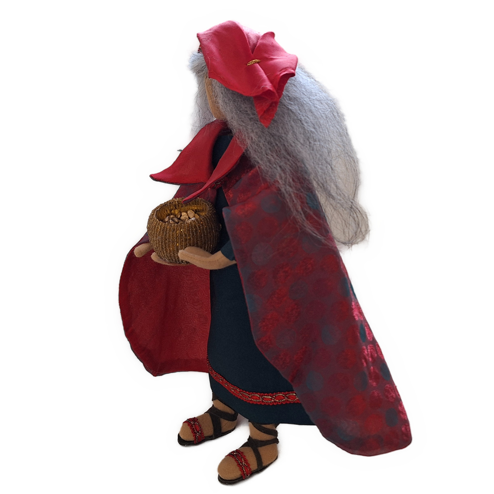 Der Umhang dieser Garnitur ist aus irisierendem Stoff genäht, der je nach Lichteinfall mehr grün oder rot wirkt. Wir haben den Umhang mit Unterkleidern in dunkelrot oder grün kombiniert. Dazu passend ist die königlich ausgefallene Kopfbedeckung. Die Spitze vom Saum des Kleides wiederholt sich in den extra dafür angefertigten Sandalen.
