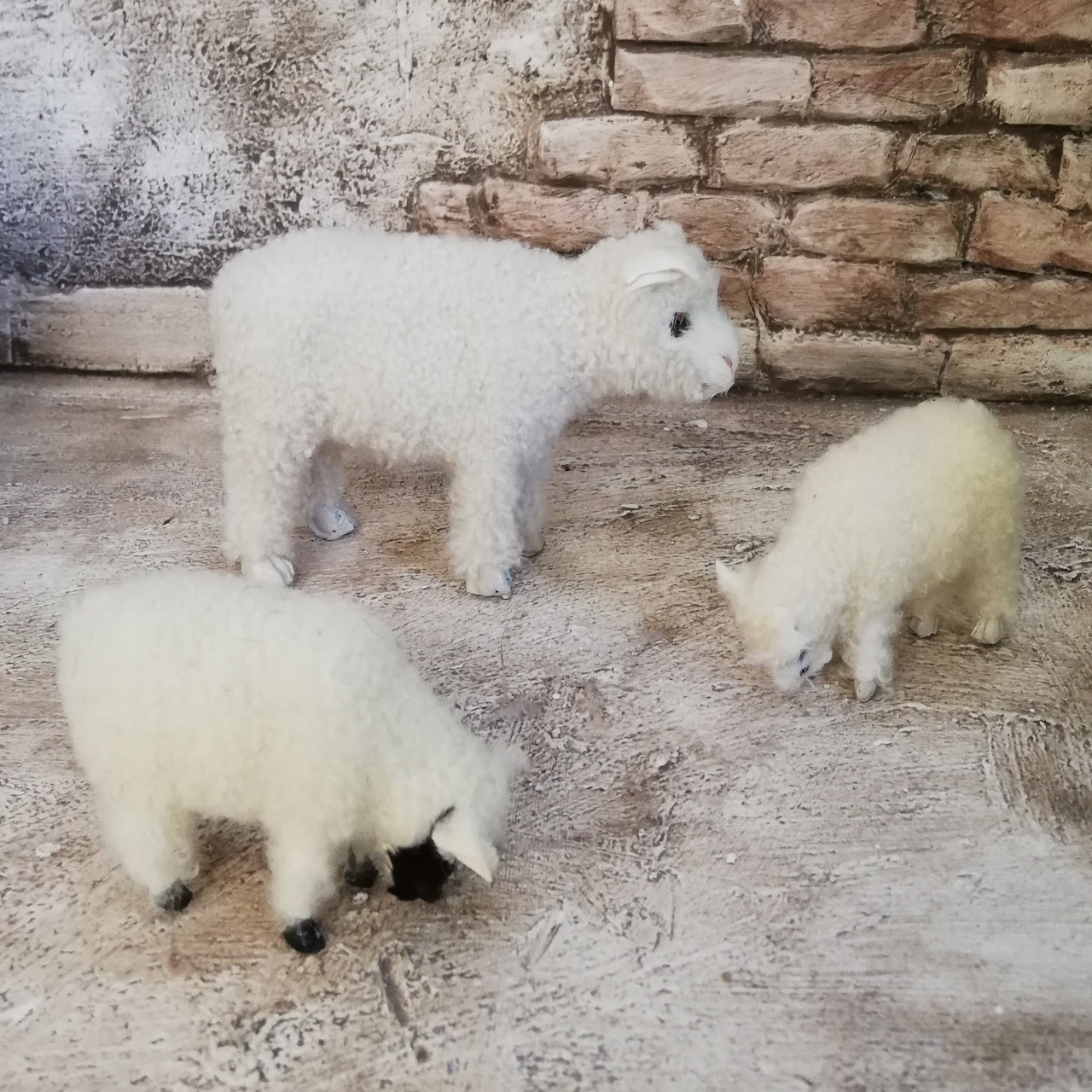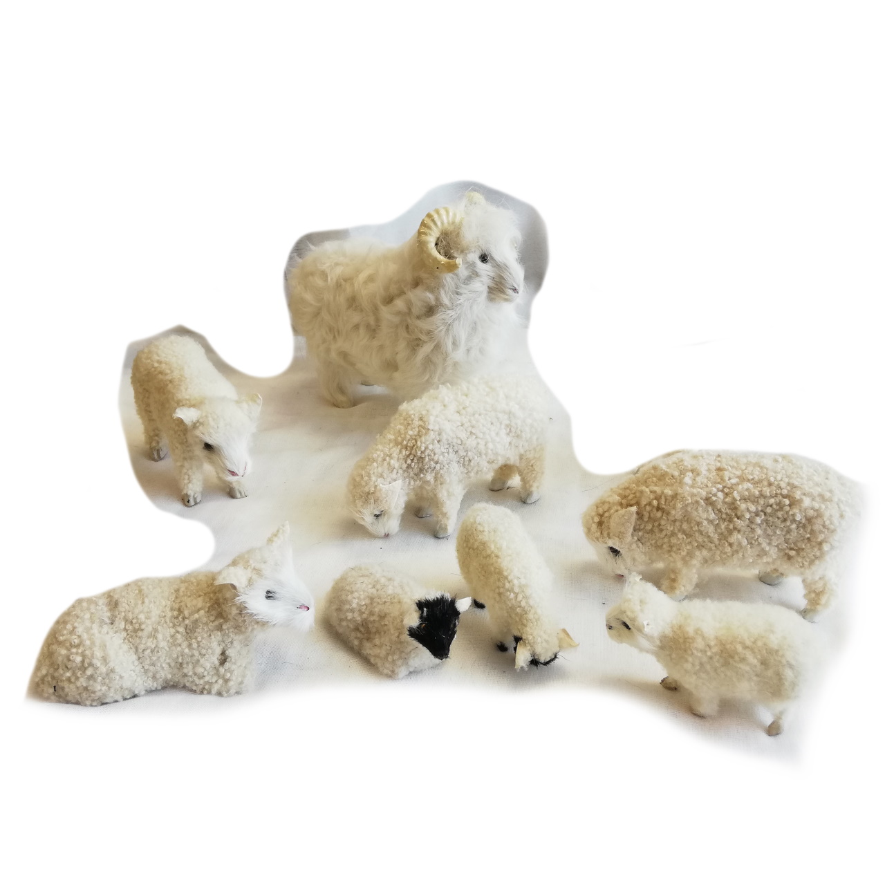 Diese Herde aus Tieren mit echtem Fell bezogen besteht aus 8 Mitgliedern. Die Schafe sind 10,5 cm hoch, die Lämmer 5 cm hoch: