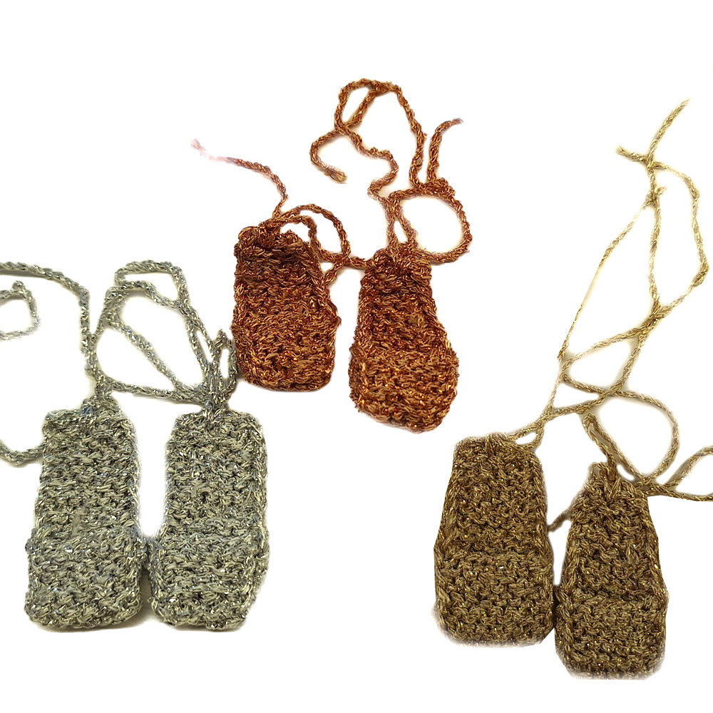Klitzeklein gestrickt sind diese Minischuhe aus Glitzergarn. Sie sind gemacht für Engelfiguren oder die Heiligen Drei Könige.