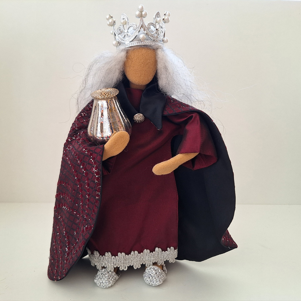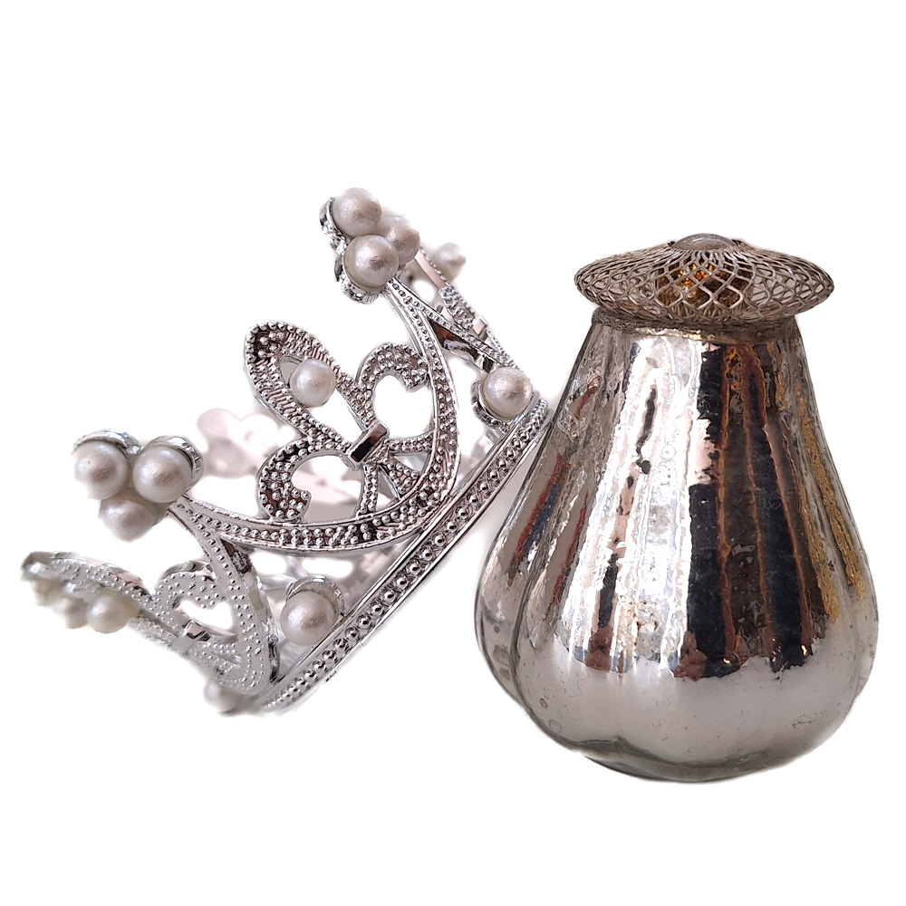 Diese beiden Teile sind derart harmonisch, dass wir sie zusammen lassen wollen. Die schöne silberne Krone mit weißen Perlen (Hartplastik, aber sehr wertig gemacht) und die Myrrhevase silbern schillernd.